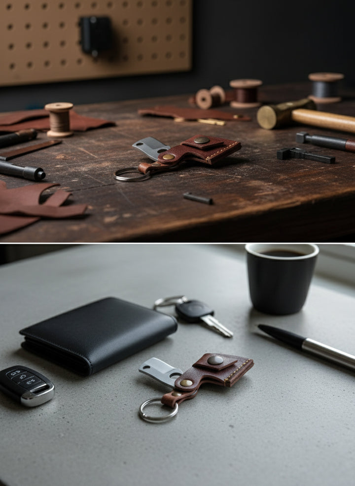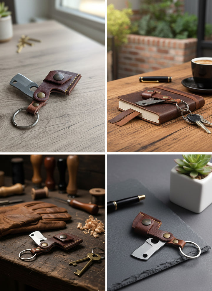 Met deze leren sleutelhanger heb je altijd een nuttig hulpmiddel bij de hand, waar je ook bent. Of je nu in de natuur kampeert, een pakketje openmaakt of een flesje opent – deze slimme gadget helpt je overal bij.
