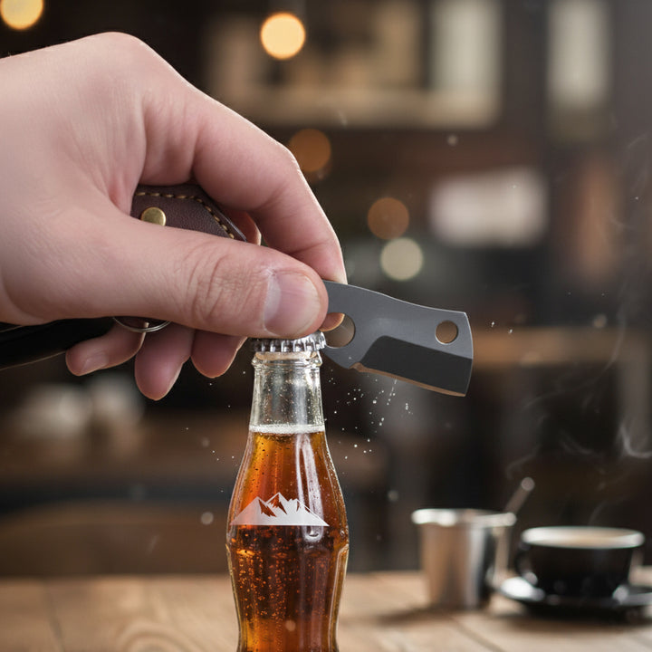 Daarnaast heeft het ook een handige flessenopener, zodat je overal eenvoudig een frisdrank of biertje kunt openen. Een accessoire dat stijl en bruikbaarheid combineert – ideaal voor avonturiers, doe-het-zelvers of gewoon als stoer cadeau!